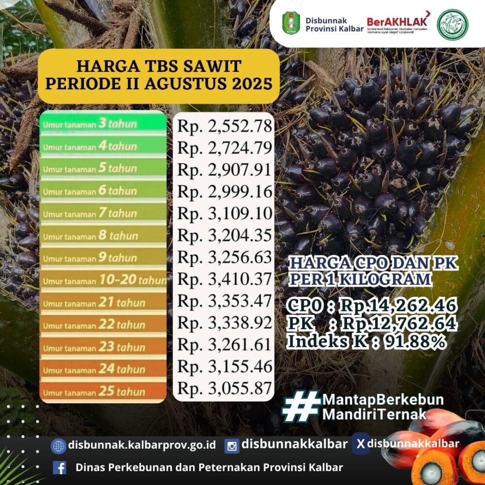 Pontianak, Kalbar – Halokalbar.com Dinas Perkebunan dan Peternakan (Disbunnak) Provinsi Kalimantan Barat (Kalbar) secara resmi merilis harga Tandan Buah Segar (TBS) kelapa sawit untuk periode II bulan Agustus 2025. Pengumuman ini menjadi acuan penting bagi para petani sawit di seluruh wilayah Kalbar.