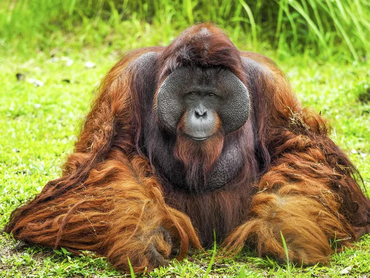 Orangutan Borneo (Pongo pygmaeus) — status konservasi kritis; jumlah populasinya menurun akibat hilangnya habitat.
