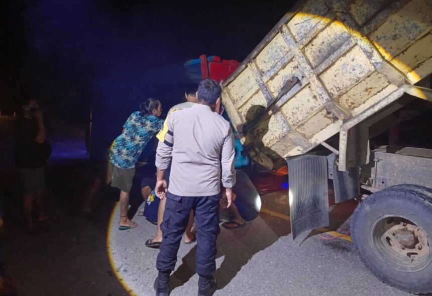 Sanggau,Haloklbar.com – Sebuah truk bermuatan sembako terguling setelah menabrak pembatas jembatan di Jalan Raya Beduai, tepatnya di Jembatan Muara Ilai, Desa Sungai Ilai, Kecamatan Beduai, Sanggau, pada Minggu malam 2 November 2025 sekitar pukul 23.45 WIB.